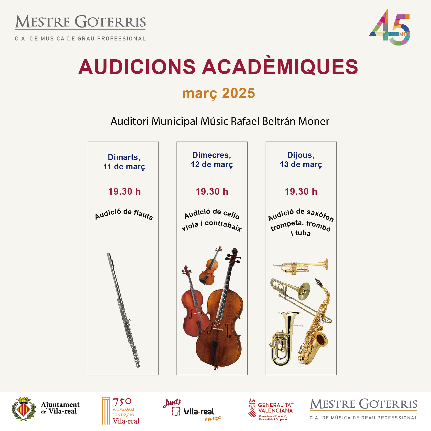 Audición académica de saxofón, trompeta y tuba por los alumnos del centro profesional de música Mestre Goterris.