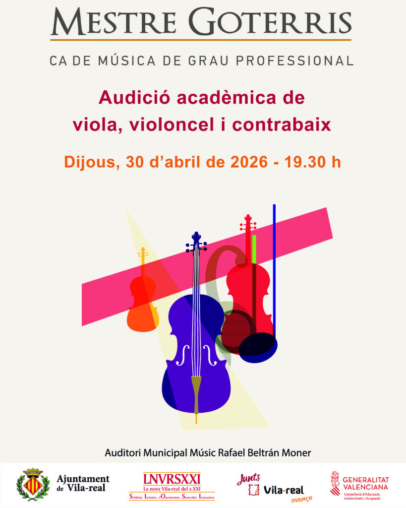 Dijous 3, de maig a les 19.30 h, tindrà lloc a l’Auditori Municipal Músic Rafael Beltrán Moner l’audició acadèmica de l’alumnat de violoncel, viola i contrabaix.