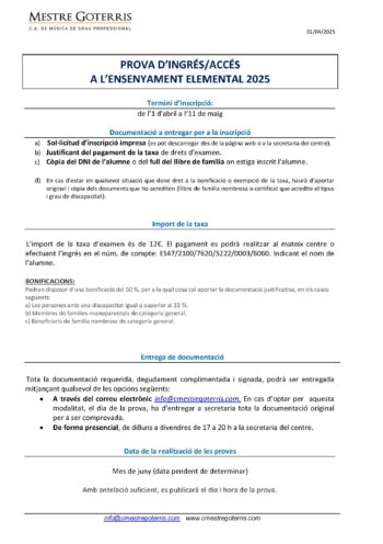 - En el mes de junio se publicará la cantidad de puestos escolares vacantes por especialidad, los plazos de inscripción para realizar la prueba y el día y hora en que ésta se realizará.